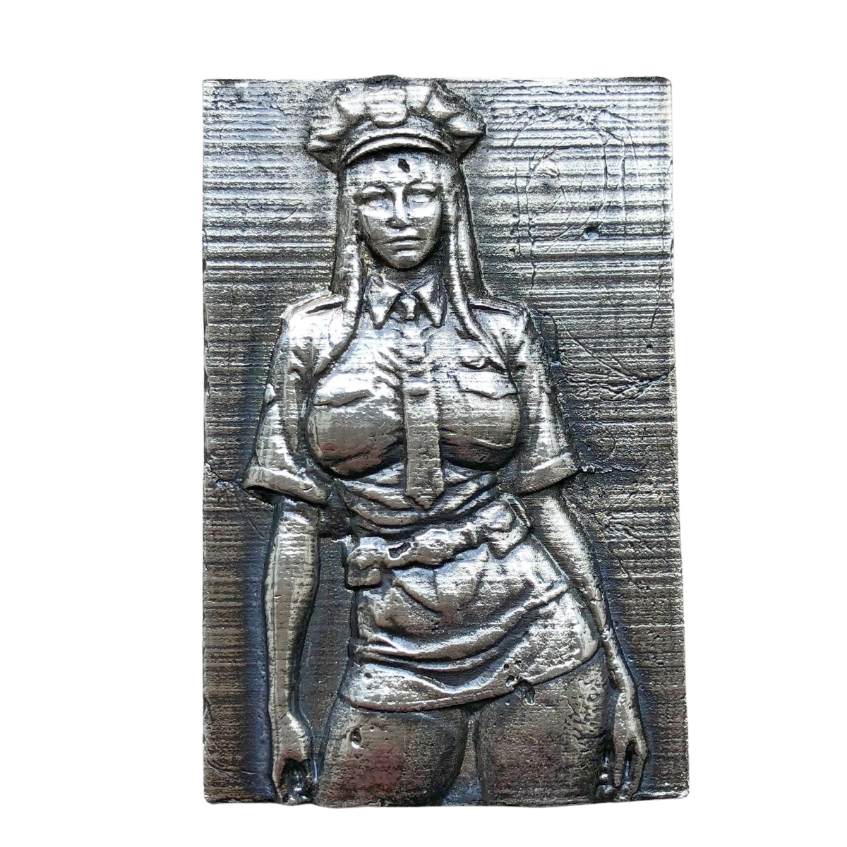 A female officer stands poised and composed.