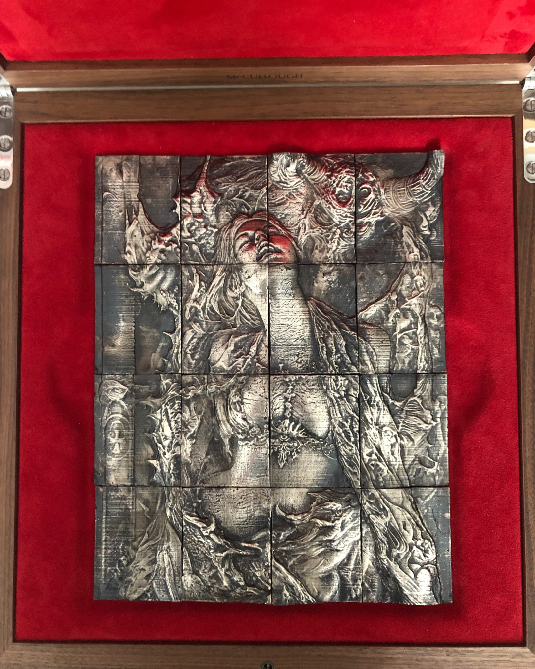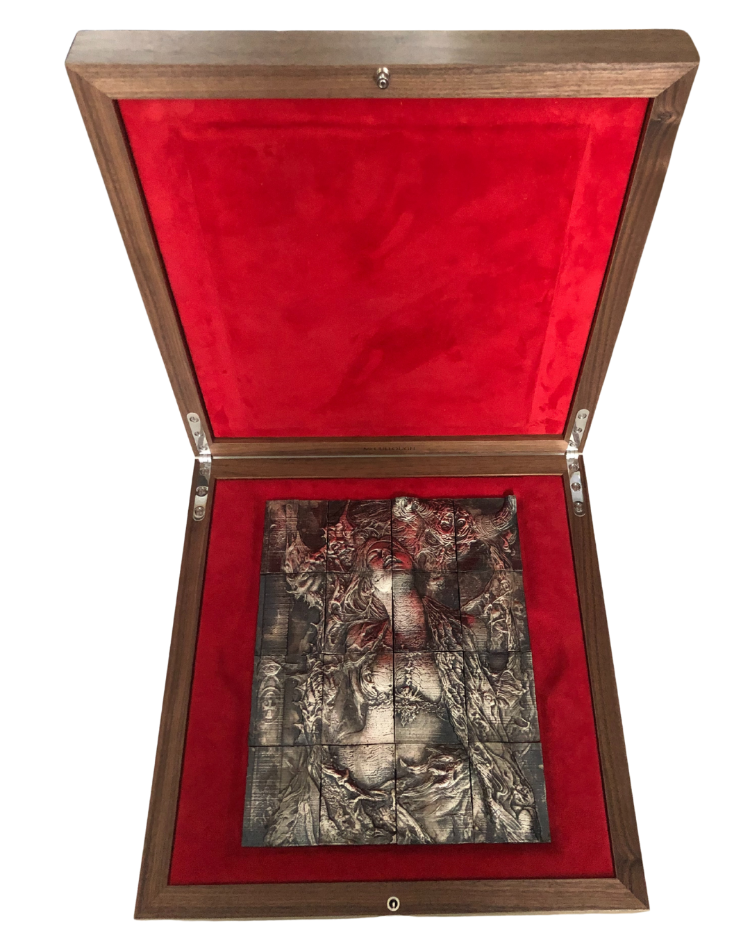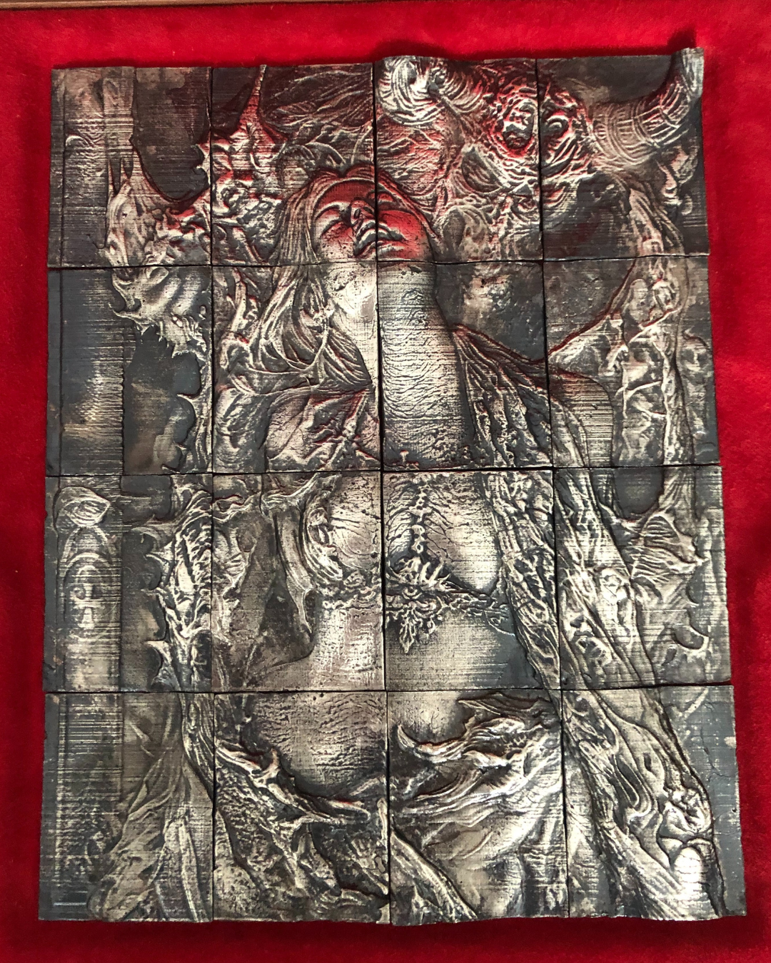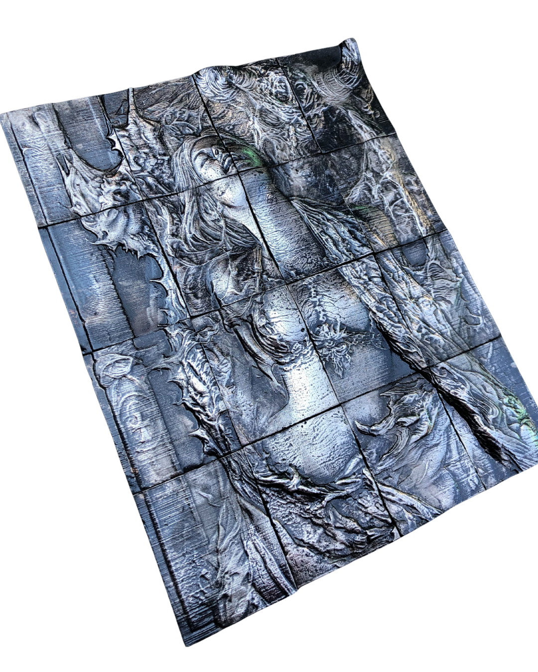 The design evokes a powerful blend of beauty, strength, and ethereal sensuality. Flowing, organic, demon-inspired forms wrap around the central female figure — a frozen moment of surrender and euphoria — balanced with dark, mythical undertones. Look closely: every viewing angle reveals new textures, hidden details, and storytelling locked beneath the surface.