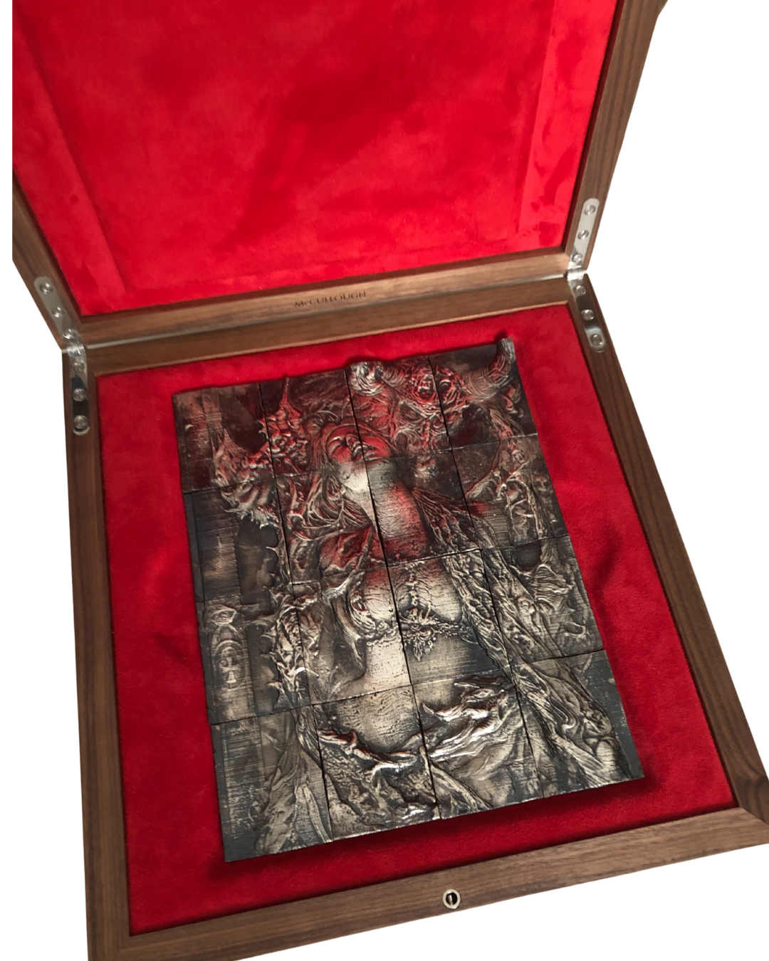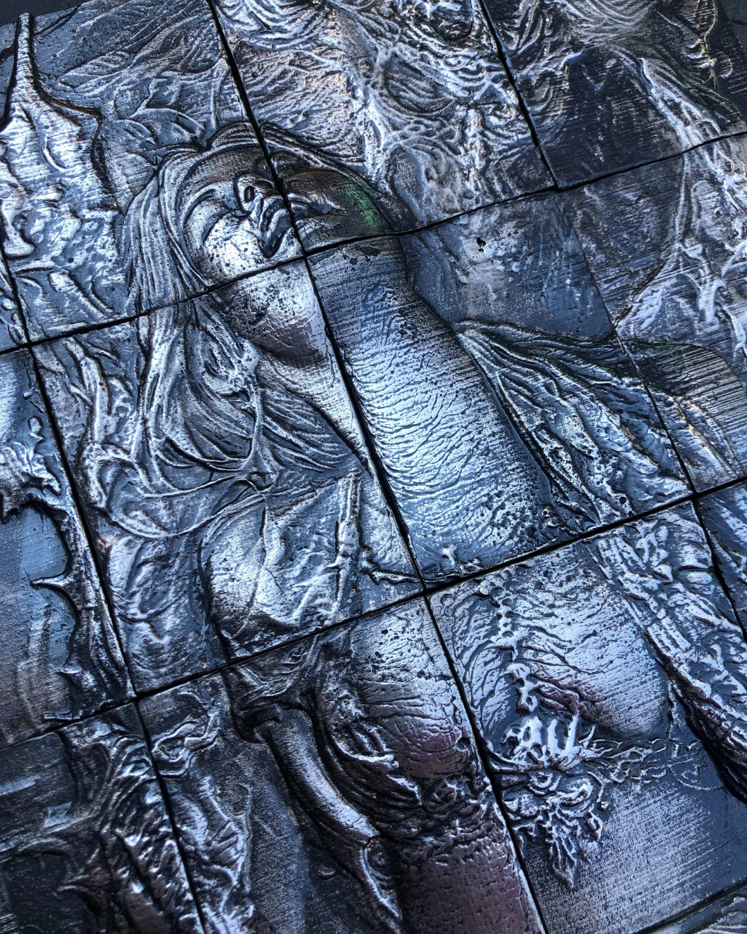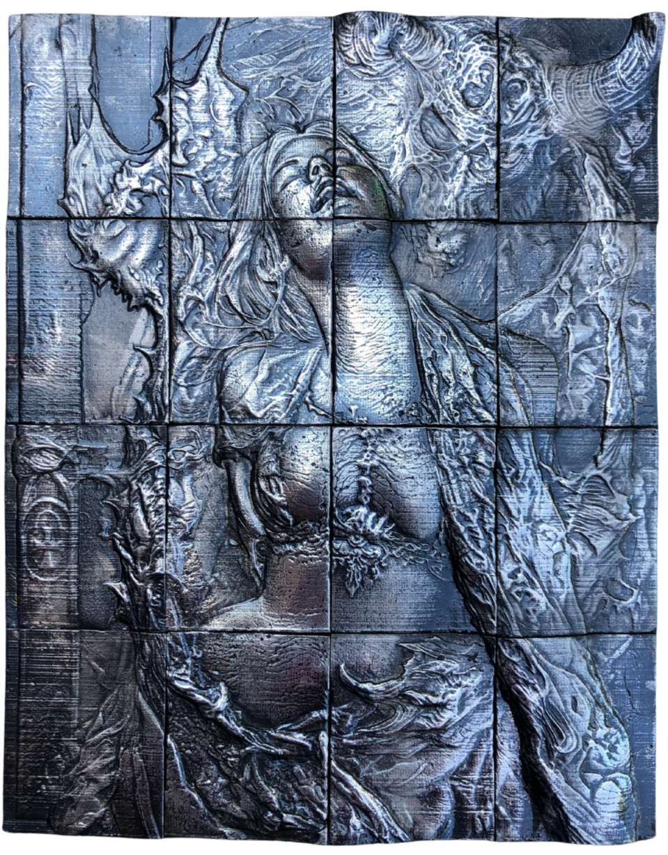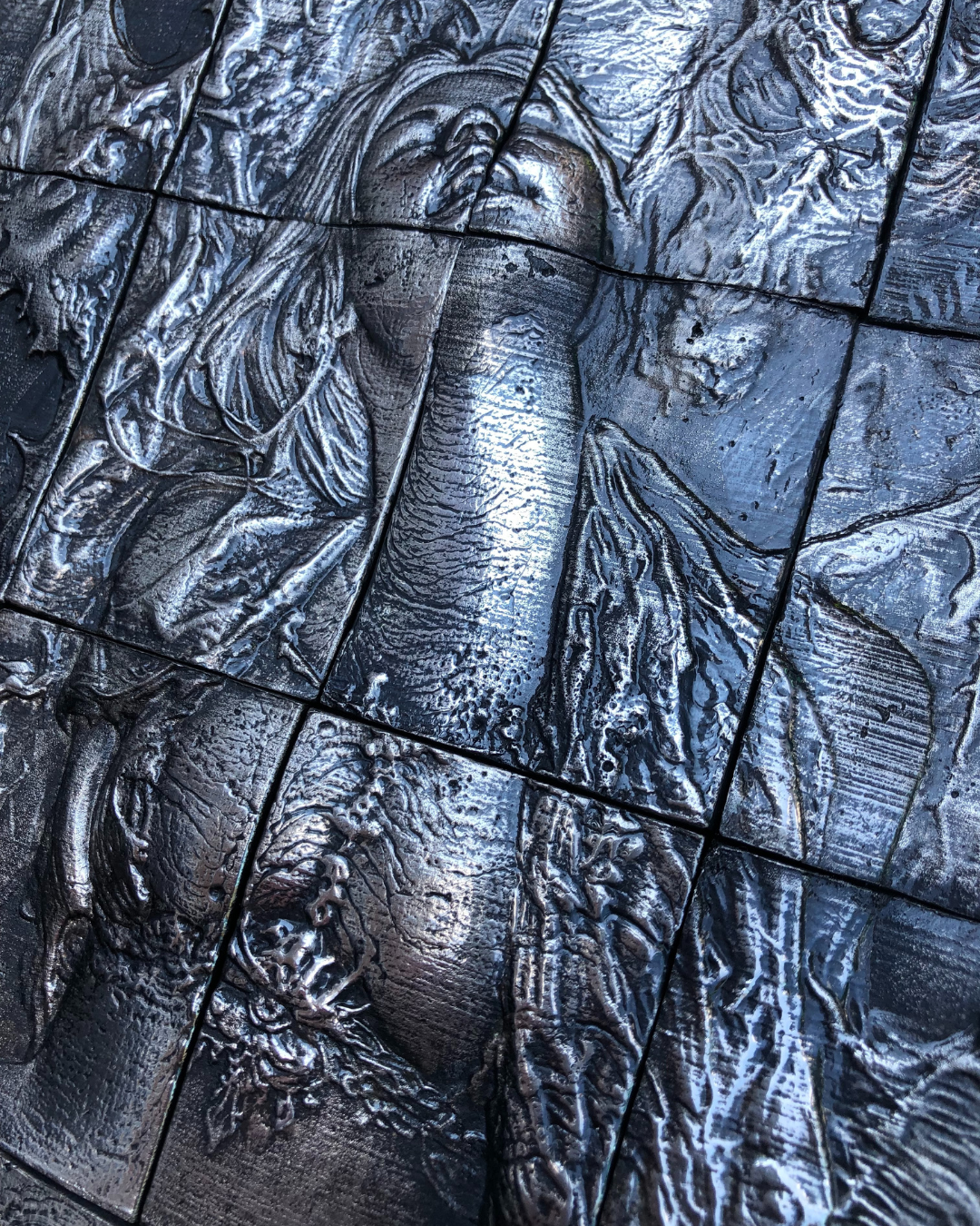 This is Ecstasy — the largest Silver Punk art panel to date. Sixteen individual hand-poured, sand-cast panels, each its own canvas, combining to form one breathtaking whole. Every piece of silver bears the fingerprint of fire and craftsmanship, revealing incredible detail and depth that only true hand-poured silver art can achieve.