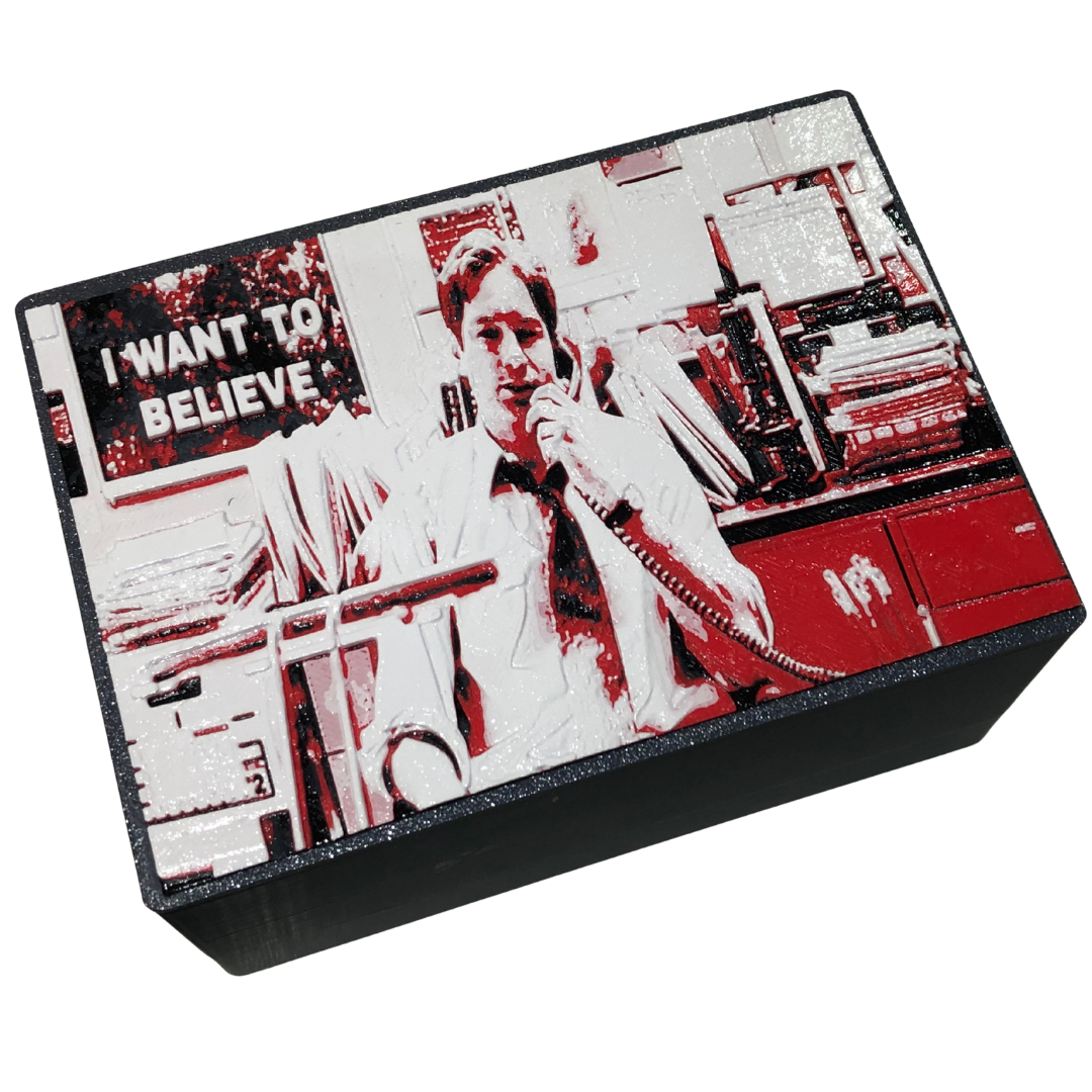 “I Want To Believe” is a one-of-one Silver Punk art panel inspired by the legendary series The X-Files, capturing Special Agent Mulder seated at his cluttered desk, phone in hand, mind racing, and the iconic poster watching over him.