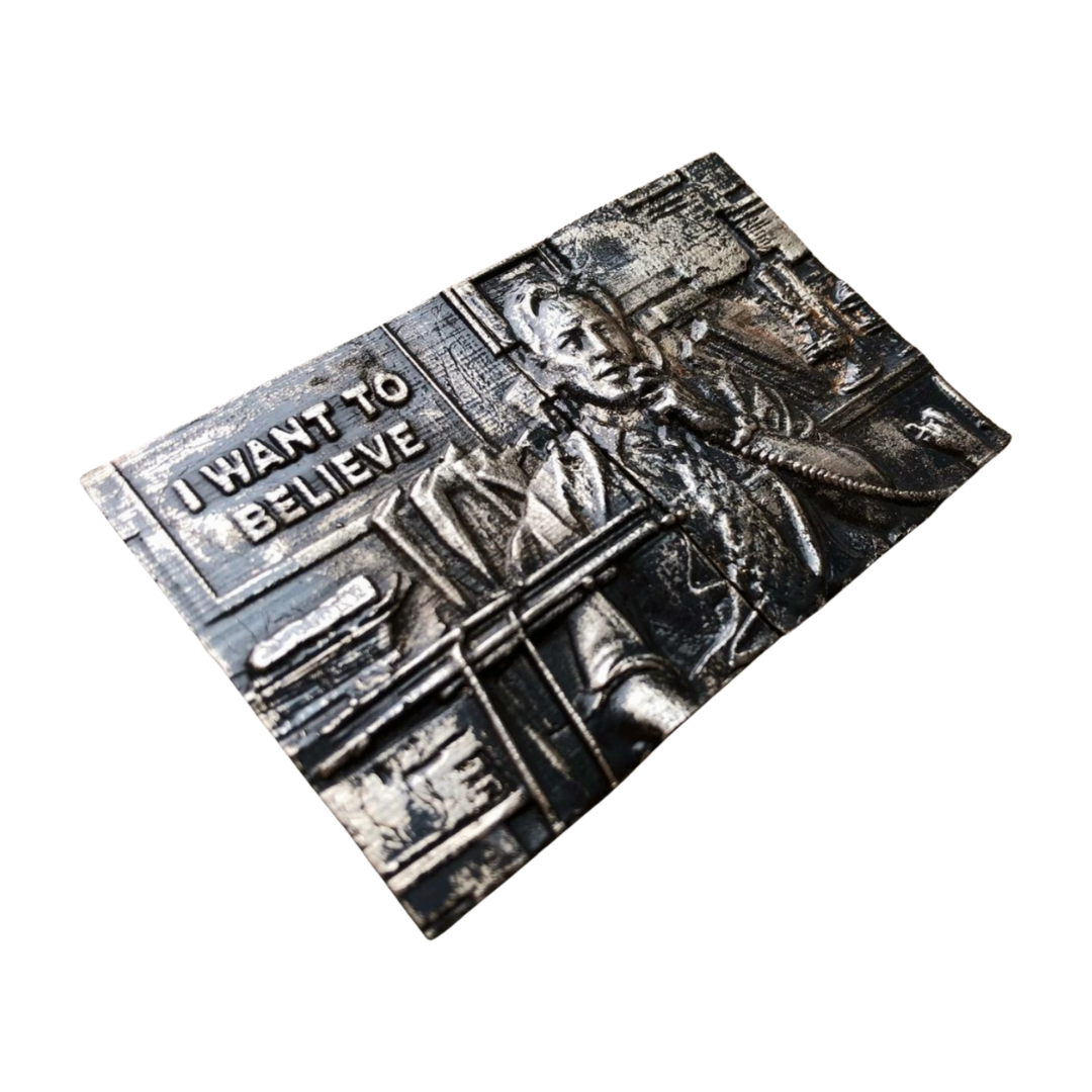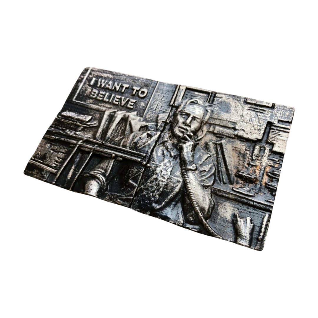 This is a sculpted moment of television history, reimagined in metal through traditional sand-casting techniques and finished entirely by hand. Every line, shadow, and raised contour carries the gritty, analogue feel of Mulder’s world, the files stacked high, the desk lamp glow, the energy of obsession.