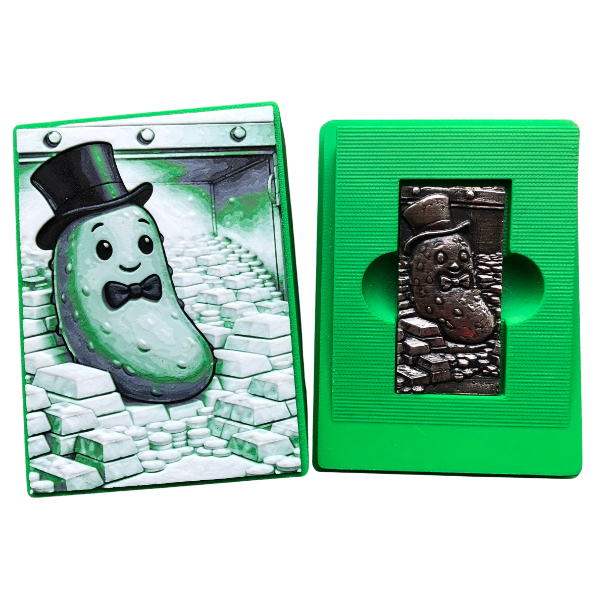 A sharply dressed pickle, top hat, bow tie, sat amongst stacked silver bars because sometimes wealth isn’t just about ounces… it’s about character.