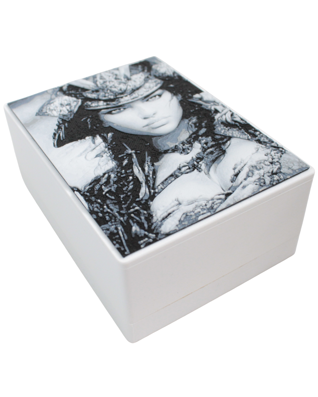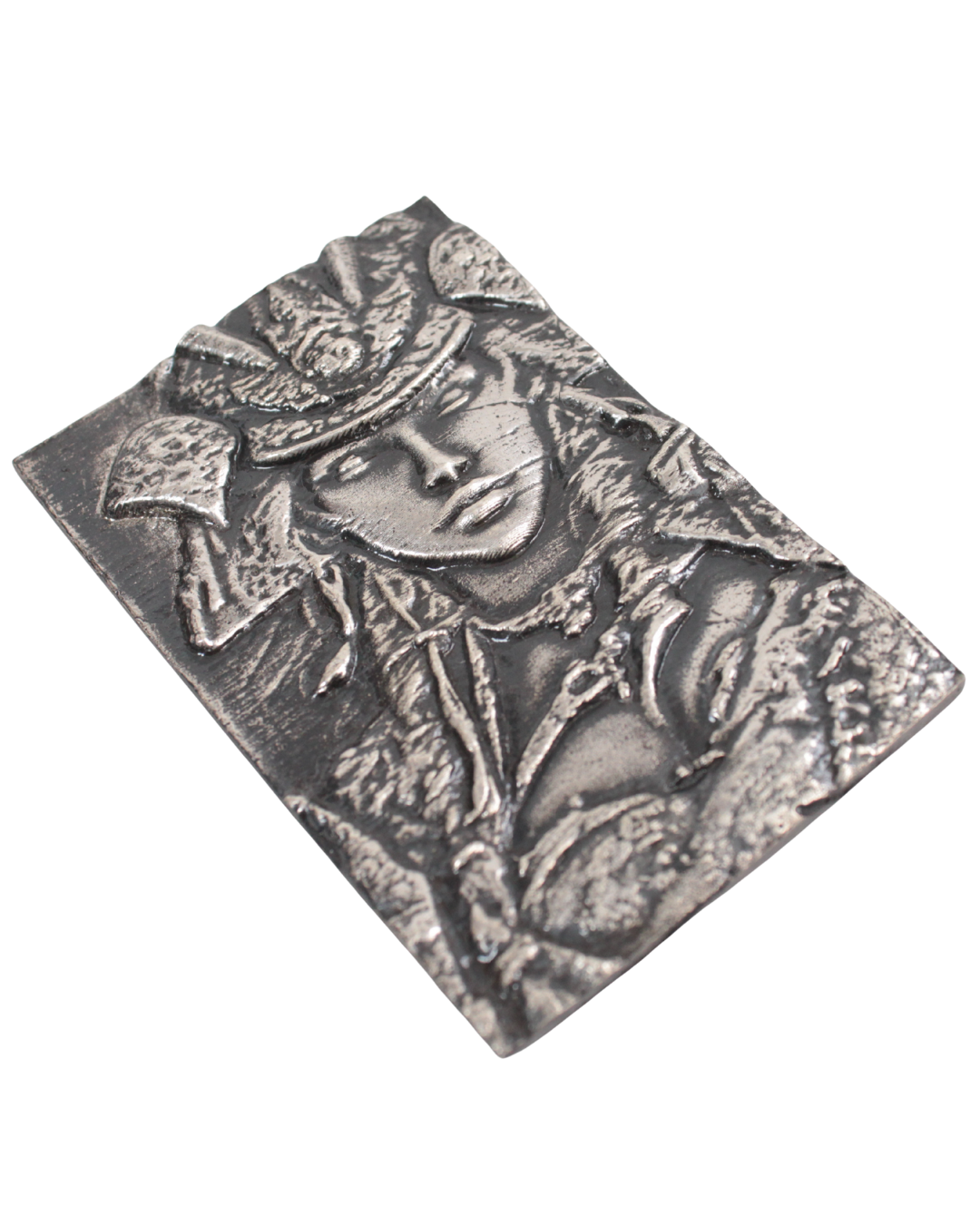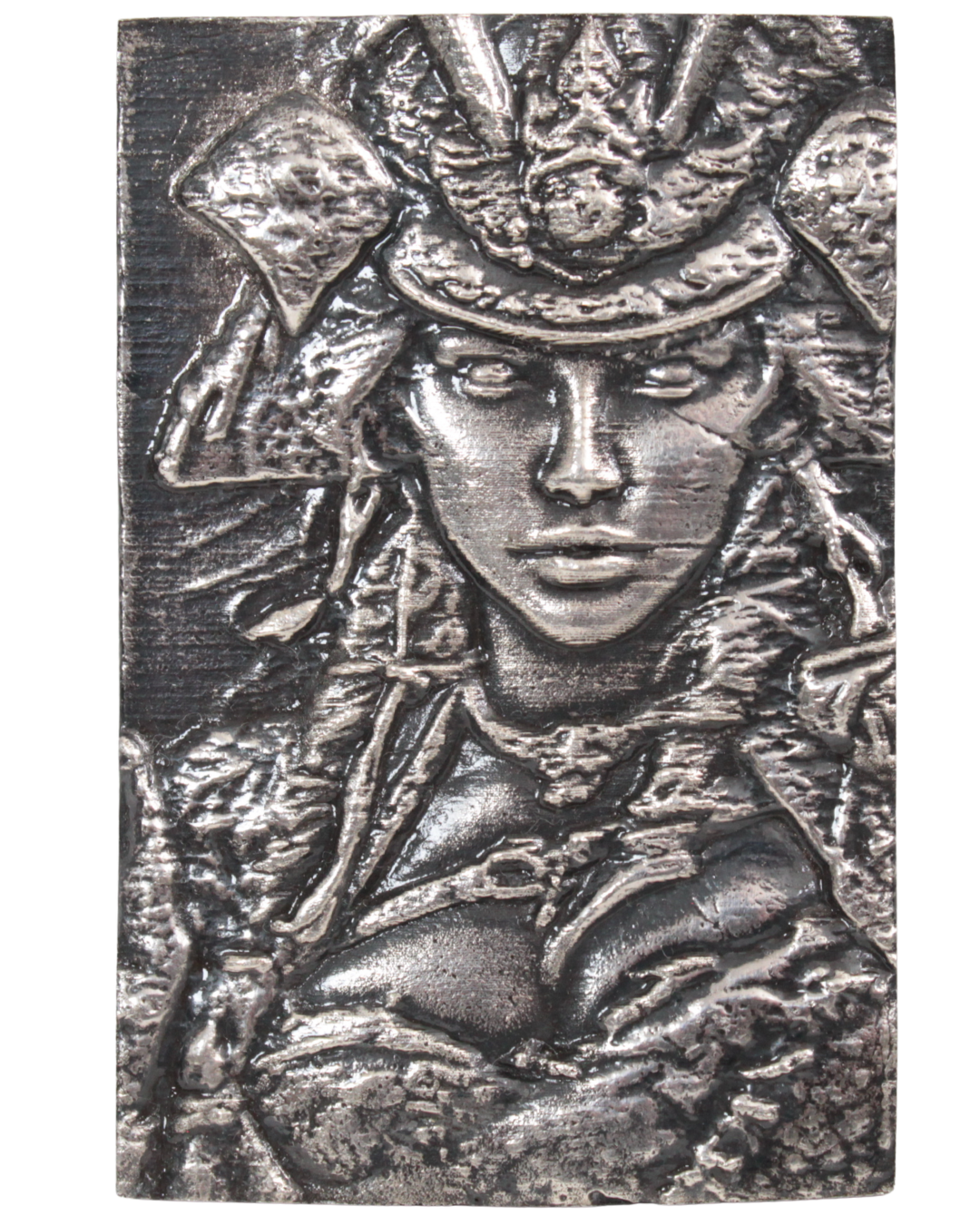 Cast in .999 fine silver with deliberately fractured, tactile textures, the piece contrasts smooth, refined facial detail with heavily worked armour and flowing elements, creating depth and movement, embodying the idea that power can be both elegant and unyielding.
