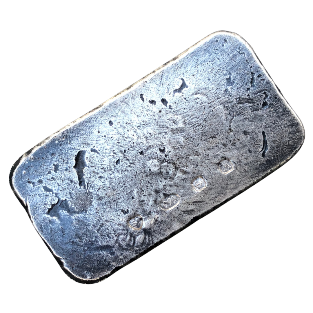 This bar is hand-poured from 83 grams of 999 fine silver, forged in a traditional graphite mould and individually hand-stamped, finished, and hallmarked by the Birmingham Assay Office (2025). A piece of tangible wealth — vintage in feel, permanent in purpose.