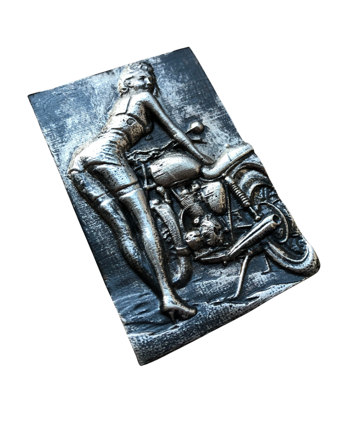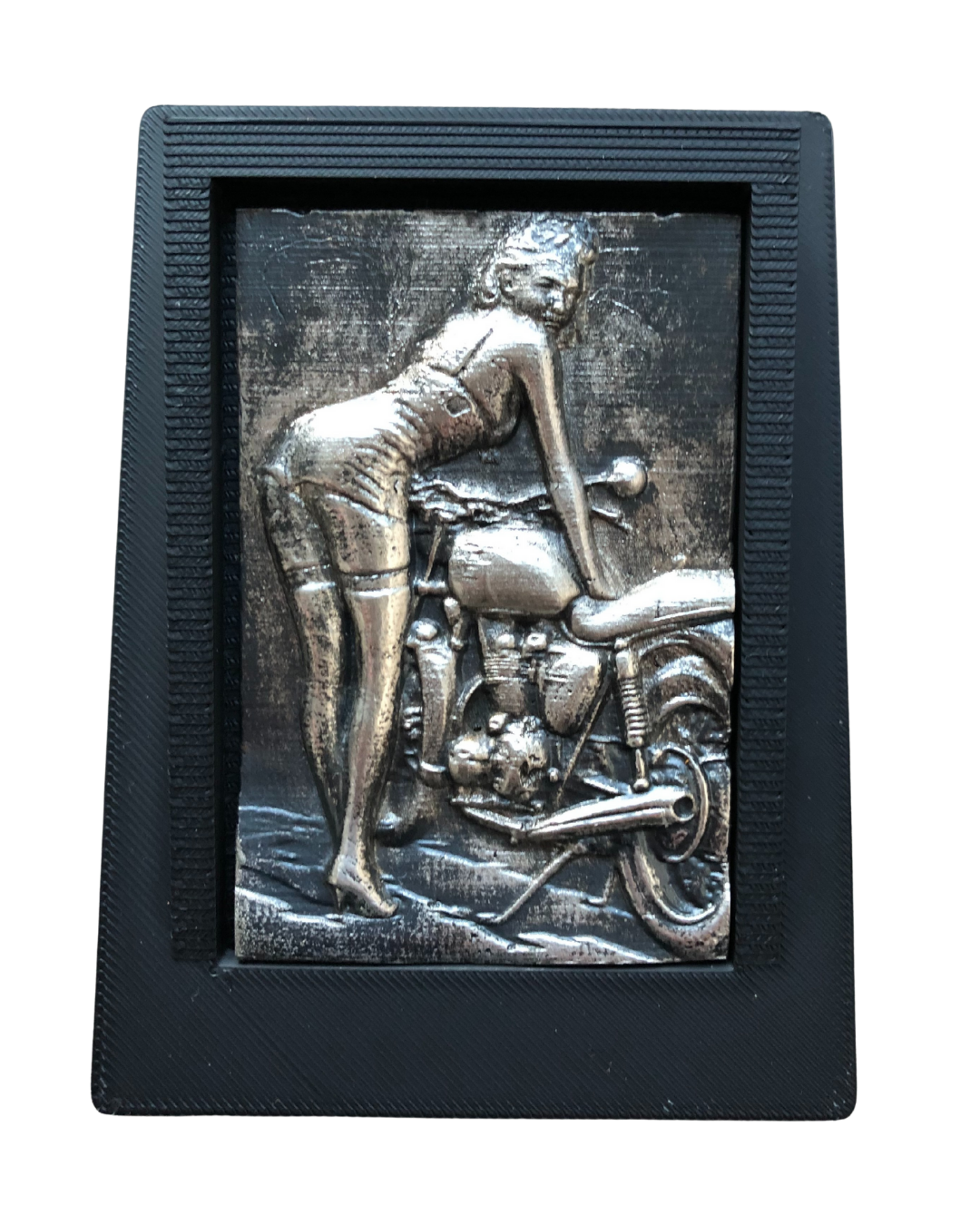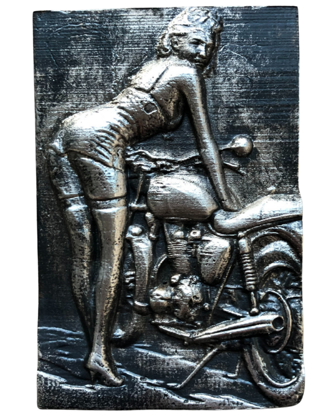 The female figure leans forward, poised and self-assured, framed by the mechanical honesty of a vintage motorcycle. Every curve, crease, and surface texture has been deliberately translated into relief, from the tension in the pose to the raw, industrial feel of the machine beneath her.