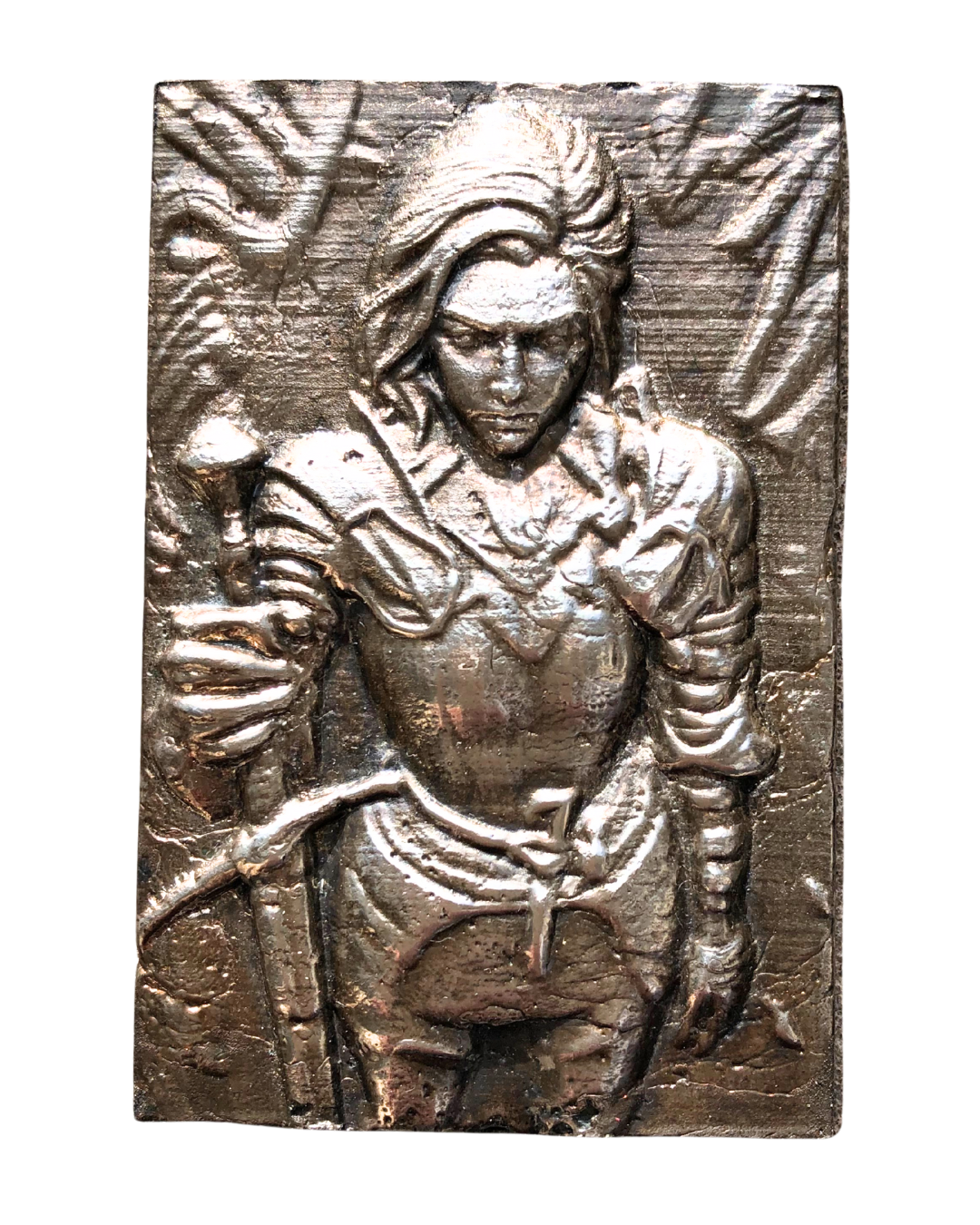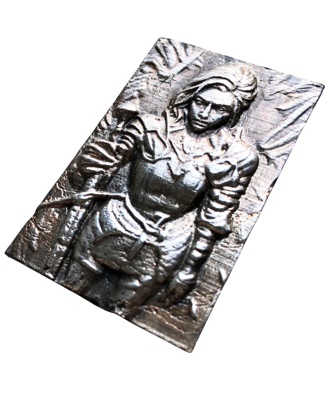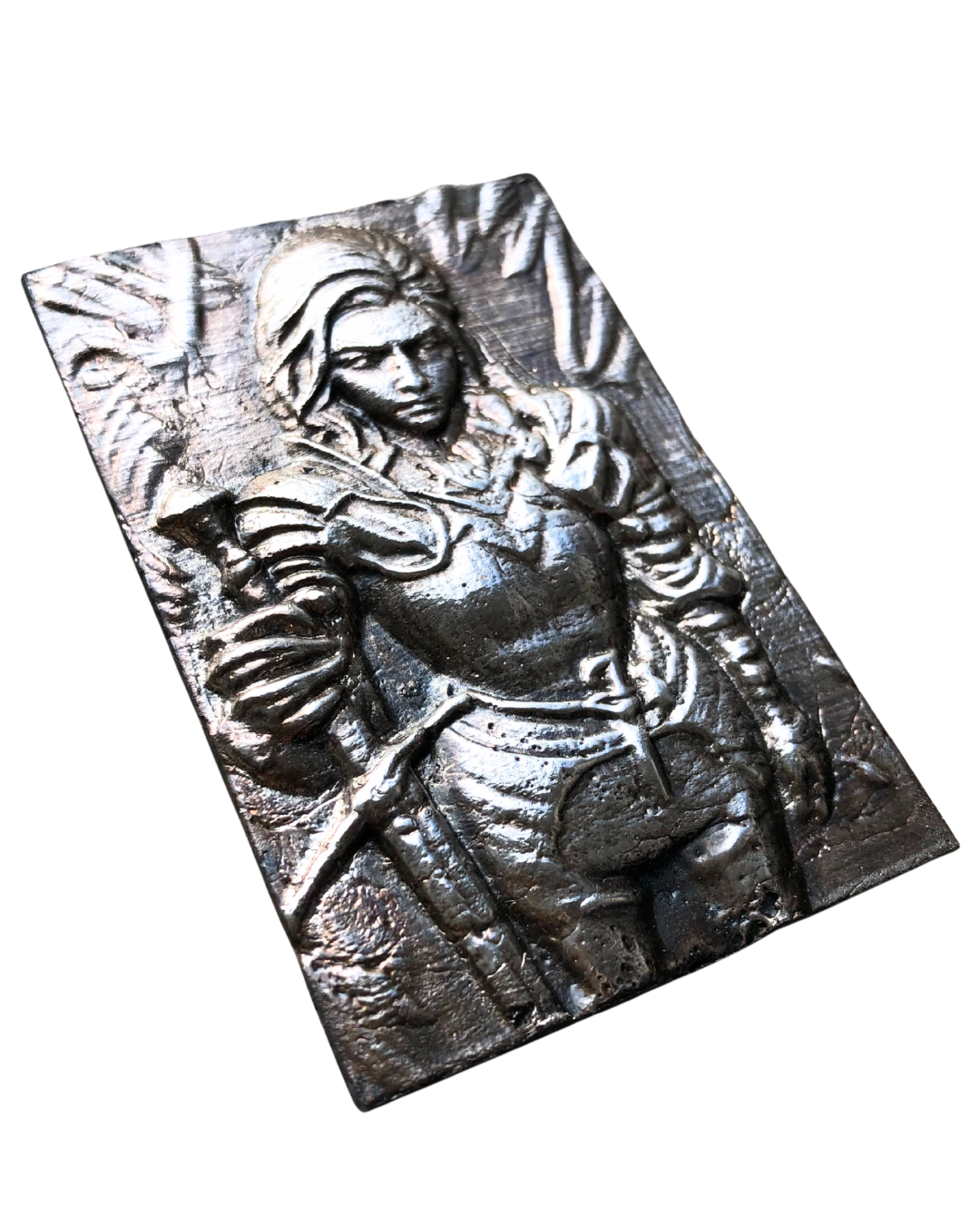 Forged in fire and cast by hand through the ancient sand-casting process, this 3.24 ozt solid 999s fine silver art panel carries the marks of its creation like armour: subtle grain, raw edges, the faint scars of molten silver tamed and cooled.