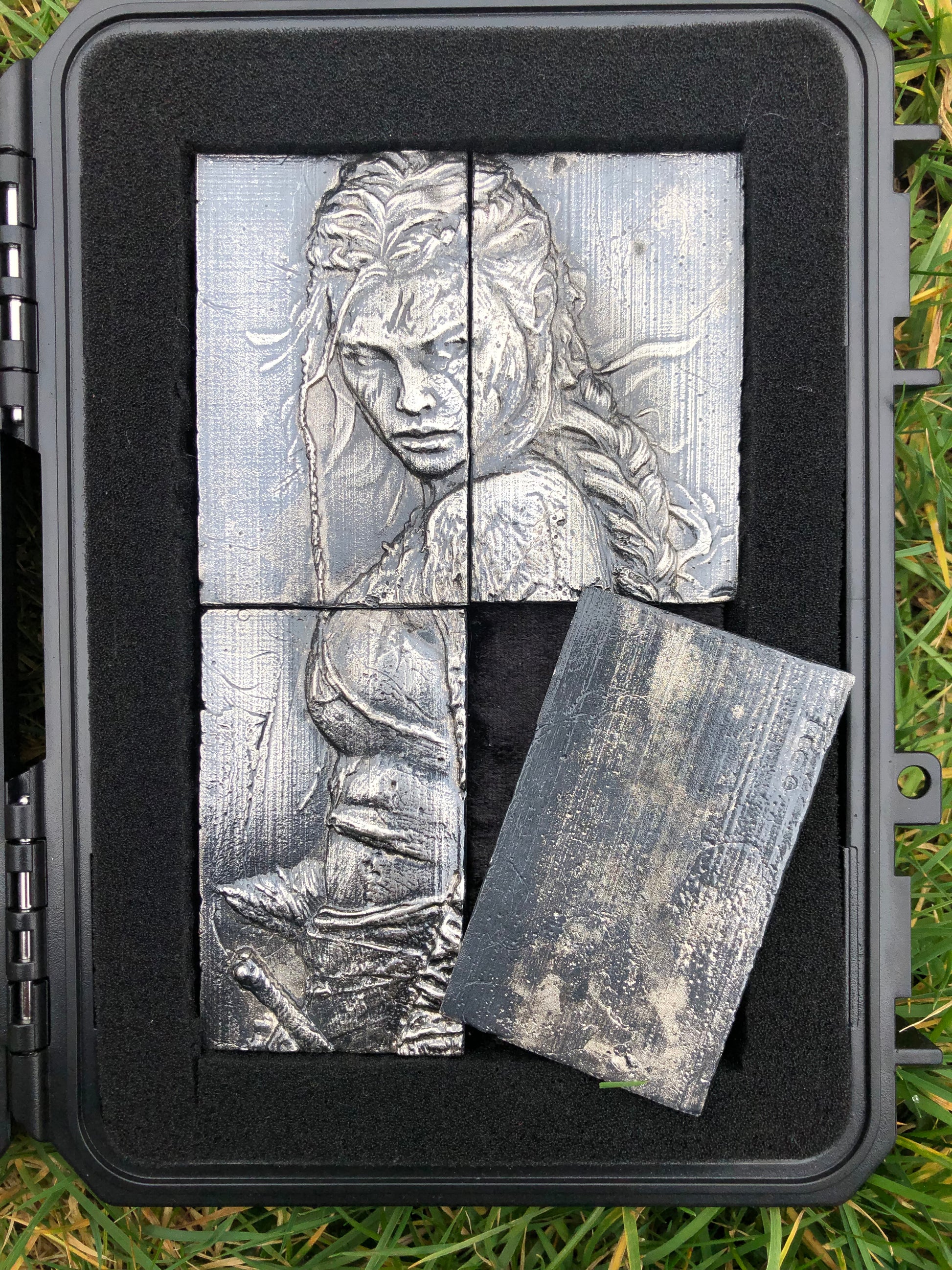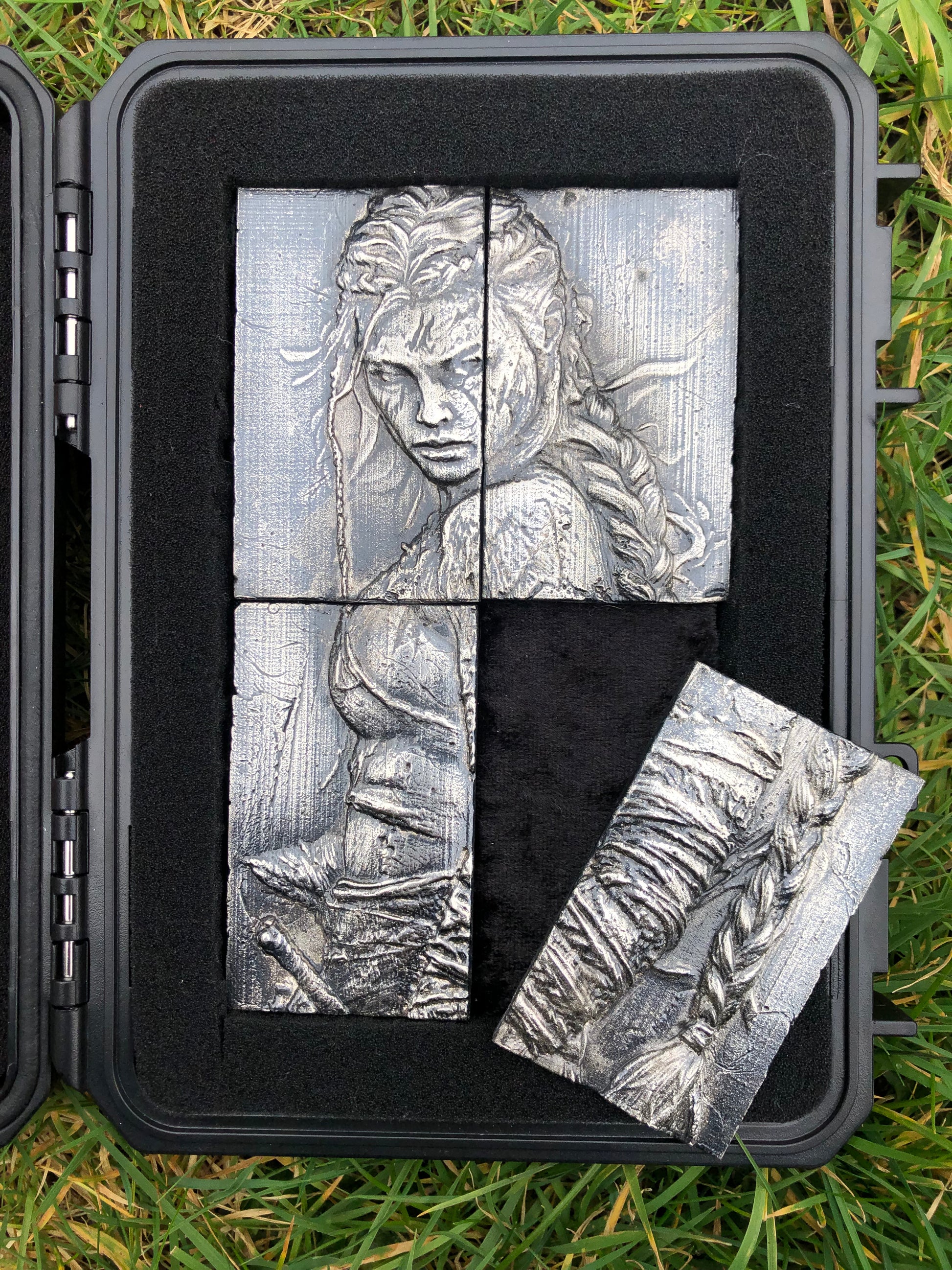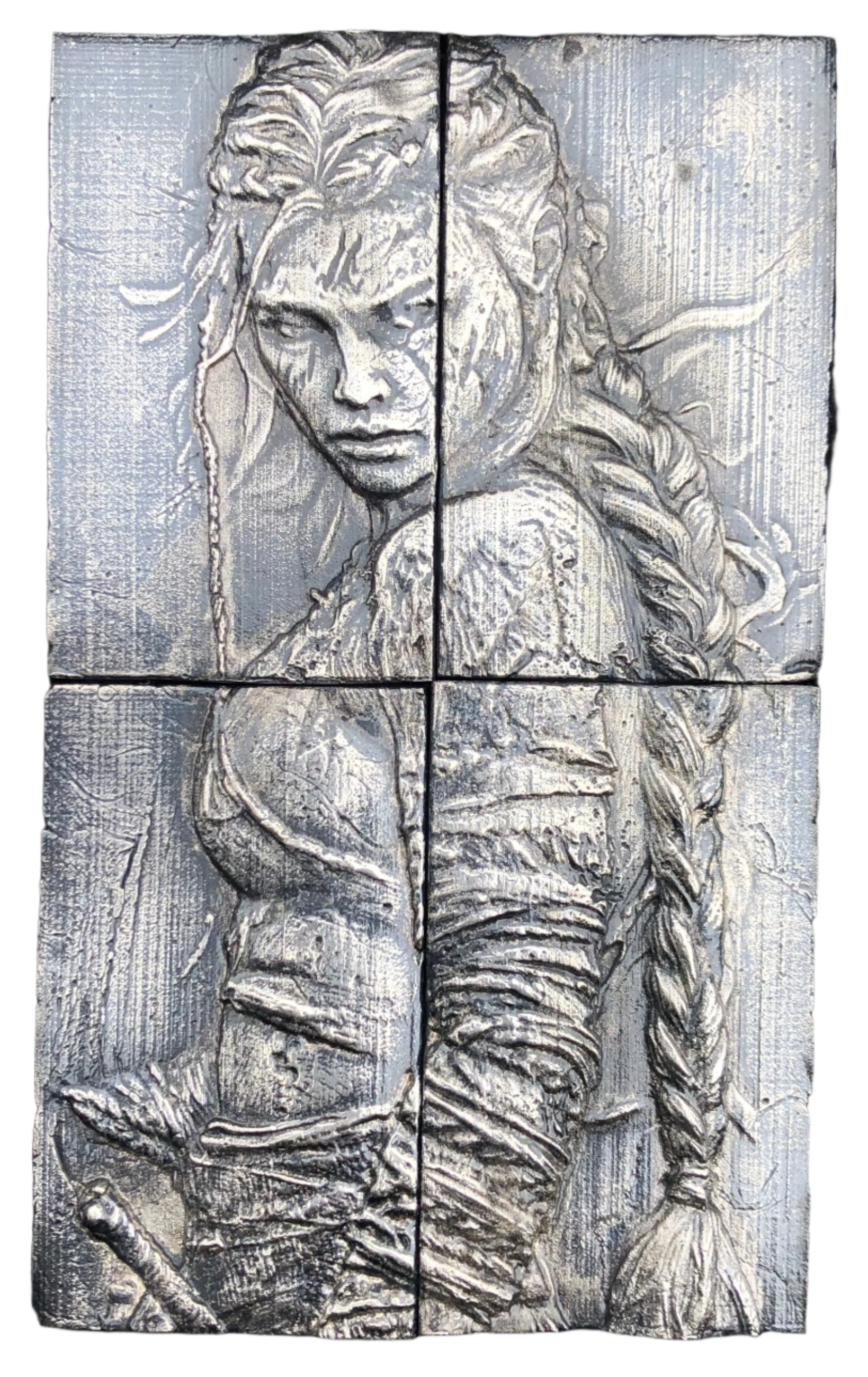 Discover a striking fusion of craftsmanship and artistry with this remarkable four-piece silver art panel, meticulously handcrafted depicting a compelling narrative in exquisite detail, this one-of-a-kind panel, titled 'The Warrior,' has been masterfully brought to life through the ancient and intricate technique of sand casting.