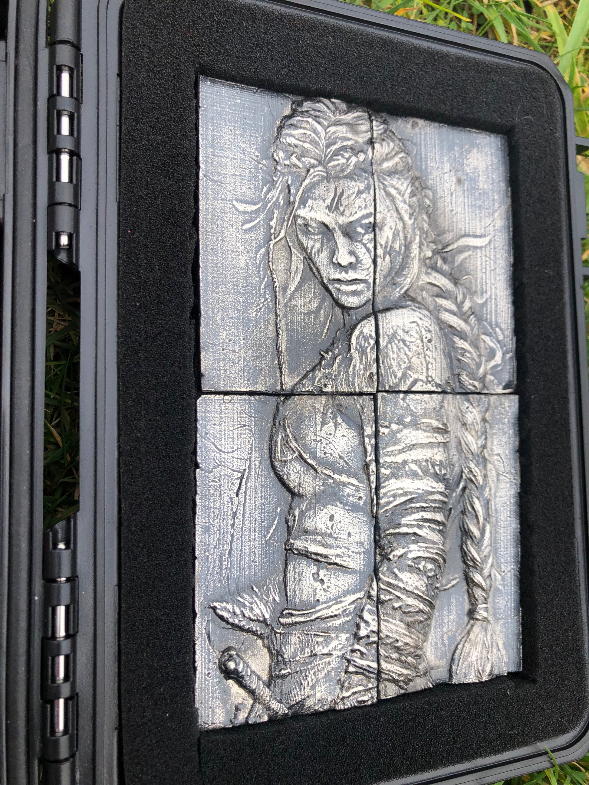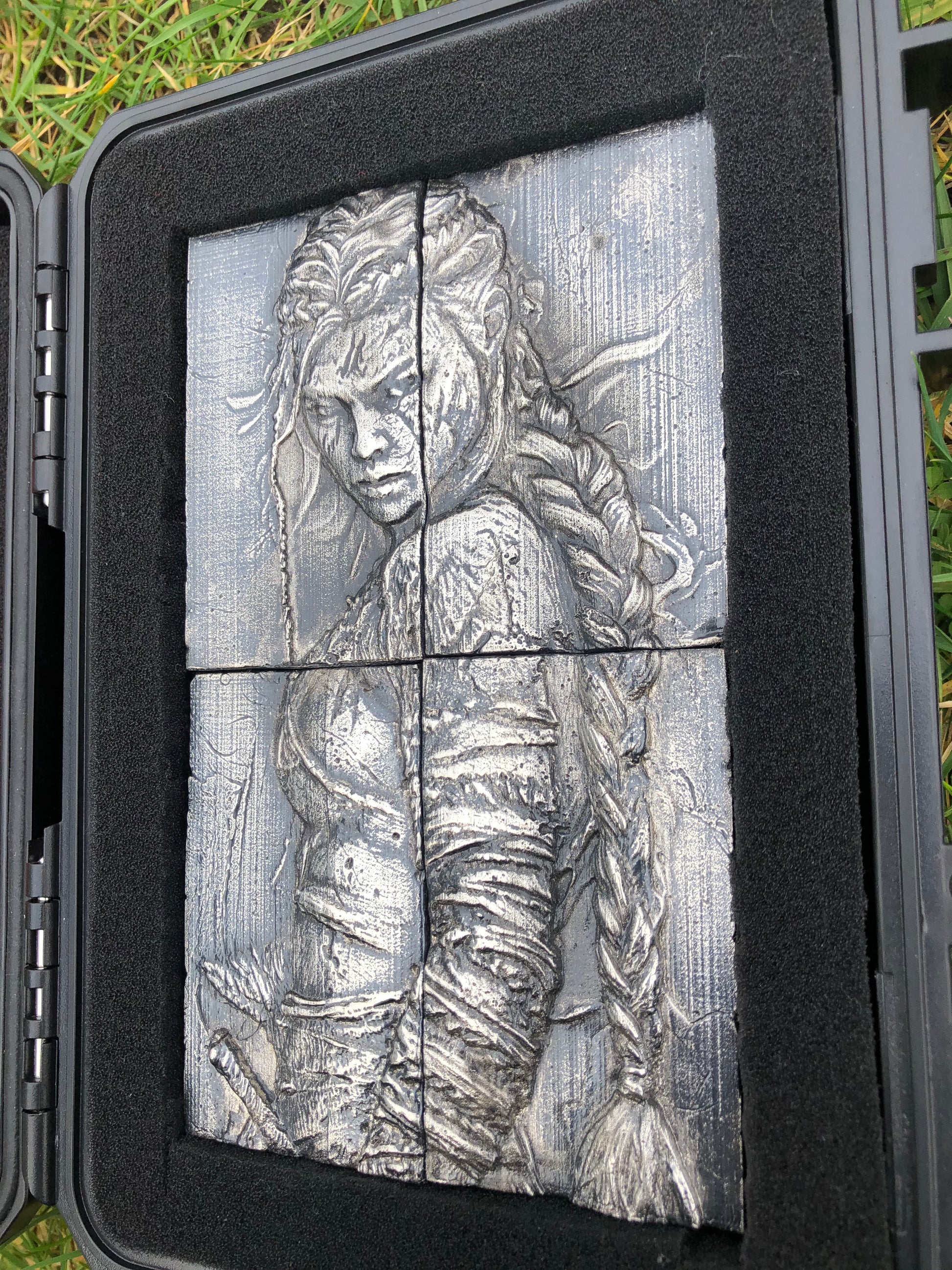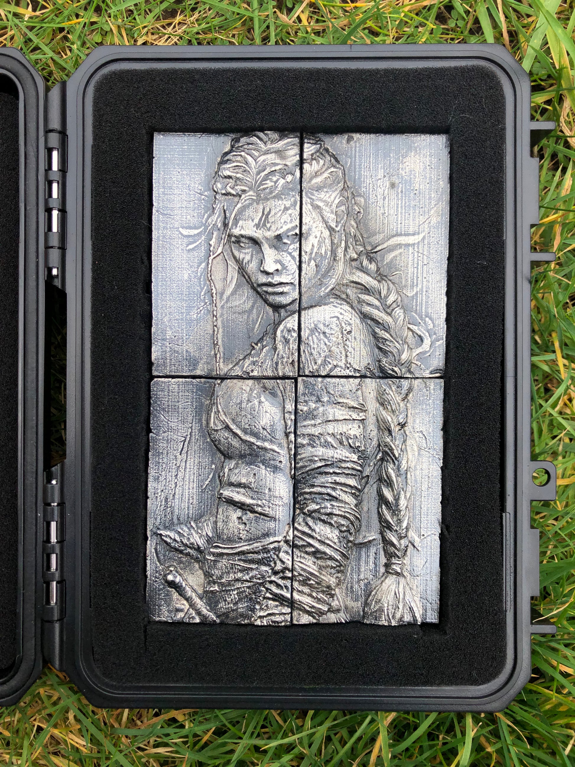 Discover a striking fusion of craftsmanship and artistry with this remarkable four-piece silver art panel, meticulously handcrafted depicting a compelling narrative in exquisite detail, this one-of-a-kind panel, titled 'The Warrior,' has been masterfully brought to life through the ancient and intricate technique of sand casting.