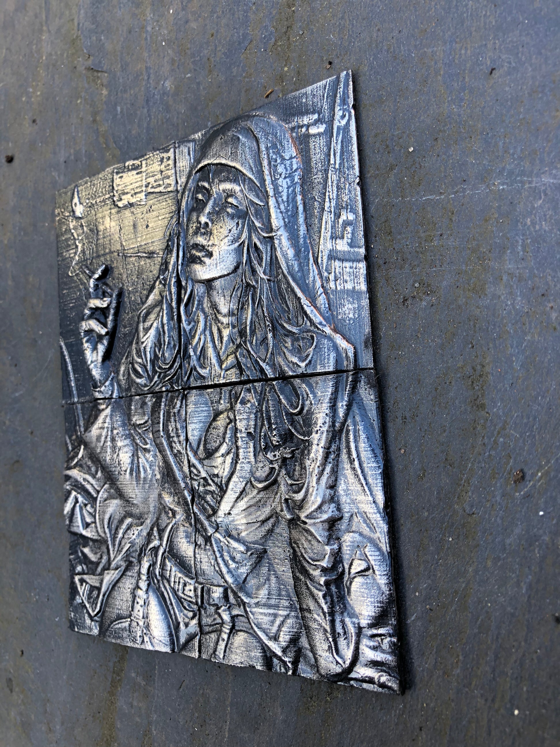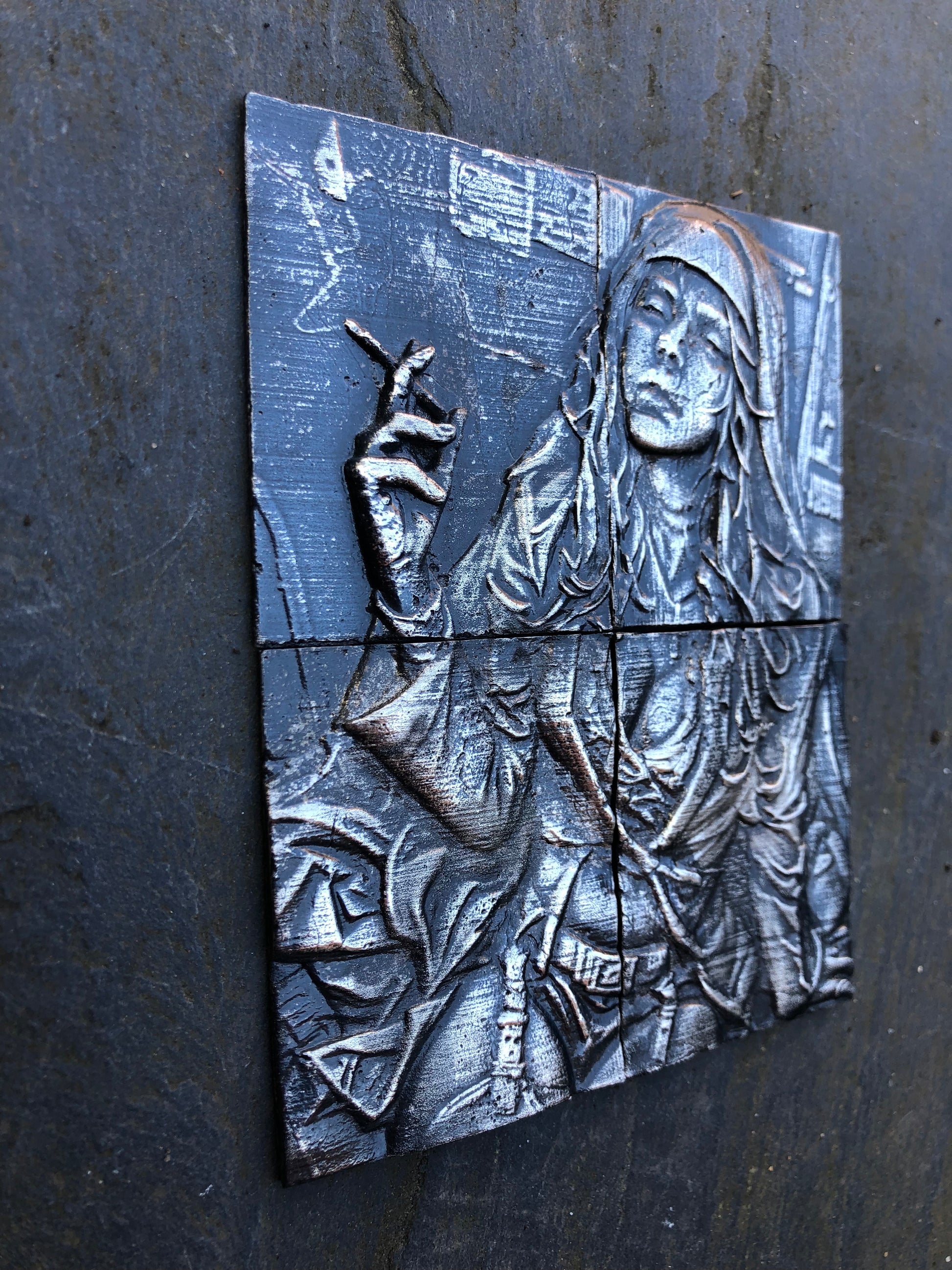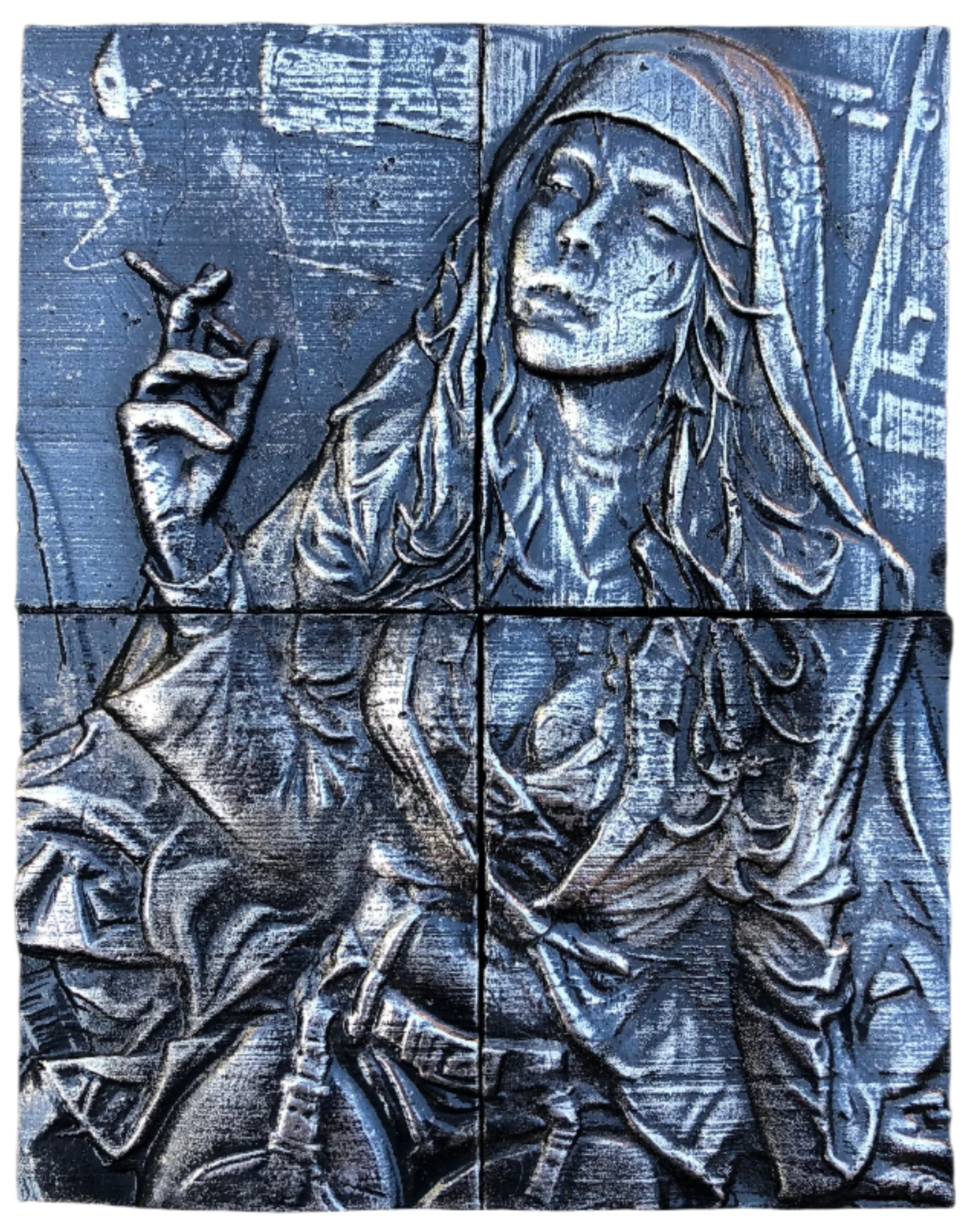 This remarkable four-piece silver art panel captures an intimate, fleeting moment a young nun, weary yet strikingly beautiful, seated on a train carriage floor, savoring her last cigarette as the world rushes by. This powerful scene, masterfully rendered in pure fine silver, speaks volumes about solitude, reflection, and the quiet rebellion found in ordinary moments.