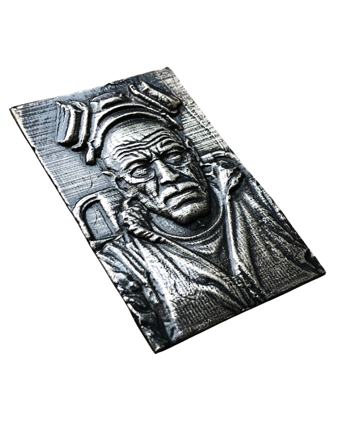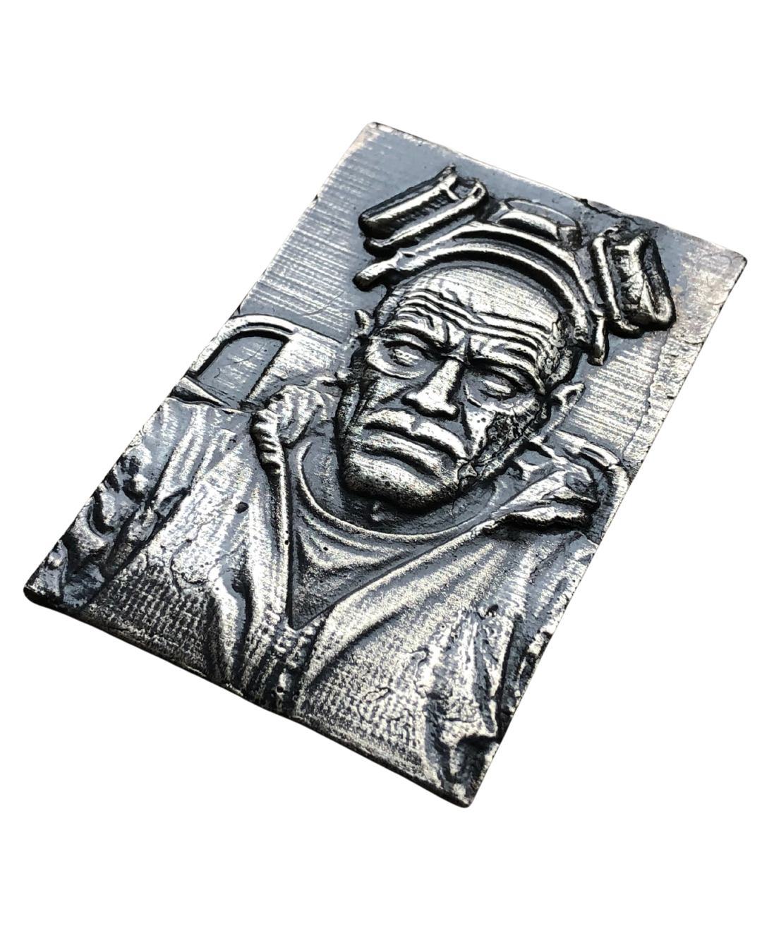 This 7.5cm × 5cm hand-poured fine-silver 2.89ozt art panel captures the duality of a man torn between chemistry and chaos, brilliance and breakdown, a portrait of control turned combustion.